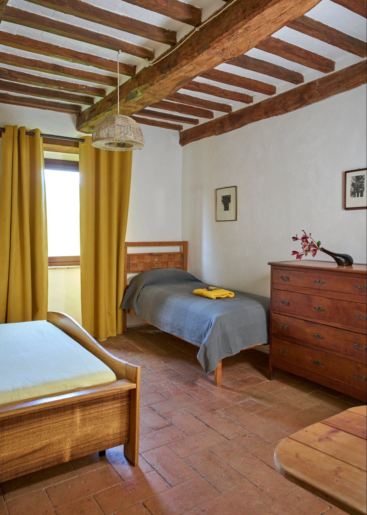 Offriamo camere private e posti letto in camere comuni, tutte con bagno privato, oltre a spazi condivisi pensati per stare insieme: una cucina attrezzata, un salone con camino e un grande giardino dove godersi il sole e la tranquillità.